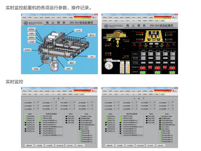 •-1、起重機(jī)狀態(tài)實時監(jiān)測:對事故易發(fā)設(shè)備和重點(diǎn)關(guān)鍵設(shè)備的運(yùn)行情況進(jìn)行實時監(jiān)測,同時 對采集的數(shù)據(jù)進(jìn)行分析整理,并把現(xiàn)場的實際數(shù)據(jù)與相關(guān)的設(shè)備運(yùn)行指標(biāo)進(jìn)行對比,超過偏 差限制時產(chǎn)生報警信息并存儲報警記錄。共享相關(guān)數(shù)據(jù),為及時發(fā)現(xiàn)和消除設(shè)備故障隱患提 供必要的數(shù)據(jù)支持。