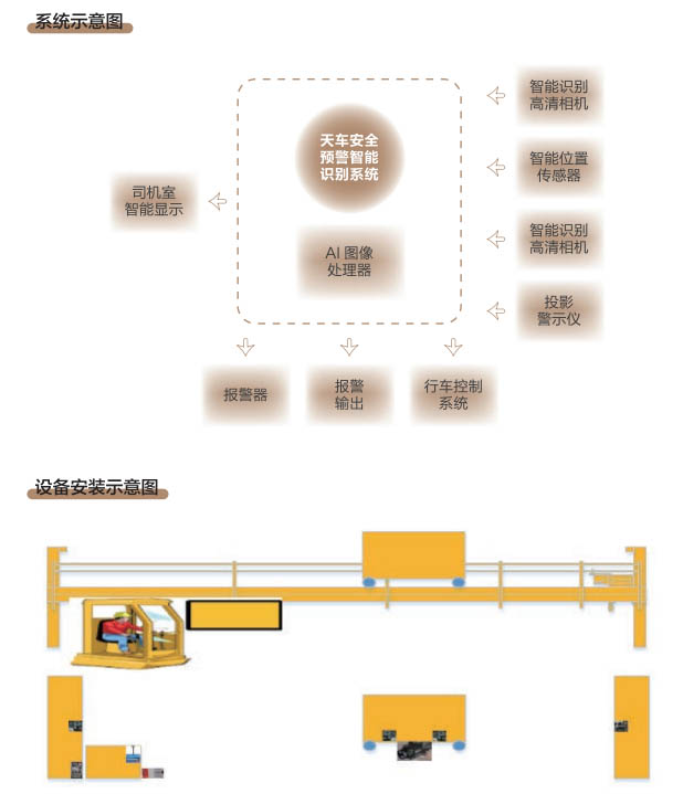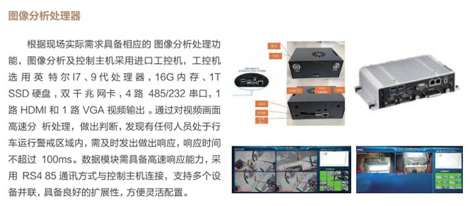6、行車智控系統(tǒng):控制系統(tǒng)采用一體化模塊集成設(shè)計, 通過各子系統(tǒng)信號采集及圖像分析進(jìn) 行智能處理,快速準(zhǔn)確判斷各功能模 塊的異,F(xiàn)象,與主機(jī)PLC控制系統(tǒng) 通訊連接具備自動進(jìn)行報警、減速、斷電停車等功能,當(dāng)系統(tǒng)確認(rèn)發(fā)出信號指令后,控制系統(tǒng)和行車PLC連鎖進(jìn)行斷電處理,避免事故發(fā)生。