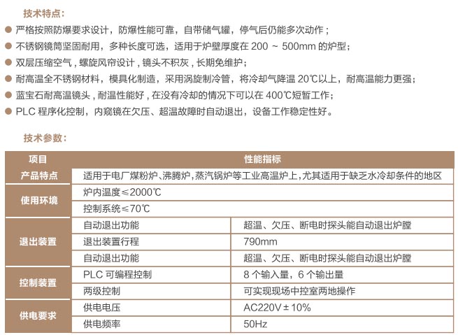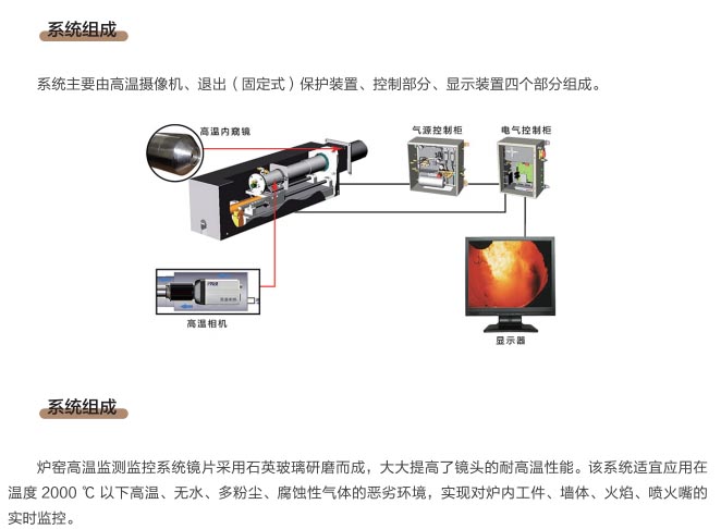 爐窯高溫監(jiān)測監(jiān)控系統(tǒng)是專為工業(yè)高溫爐窯監(jiān)測監(jiān)控的設計的智慧管理平臺,是針對爐壁開孔和爐窯視像有嚴格要求的高溫爐窯而研制的高溫工業(yè)電視。利用特種高溫孔式光學鏡頭,鏡頭設計采用中繼物鏡,兩次成像系統(tǒng),使像面在遠離觀察孔的CCD靶面上形成,最大限度的減少進入攝像機的熱輻射,致力為冶金、電力、建材、礦山、化工等行業(yè)服務。我公司研發(fā)主導產品已擁有第三代SG內窺式高溫工業(yè)電視系列、爐壁式高溫工業(yè)電視系列、內窺式拐角高溫工業(yè)電視系列、鍋爐汽包水位電視系統(tǒng)等成套設備,以及各種風冷防護罩,水冷防護罩,渦旋制冷防護罩等工業(yè)監(jiān)控設備配套產品。產品廣泛應用于鋼鐵廠加熱爐、退火爐,電廠鍋爐爐膛火焰、水泥廠回轉窯窯頭看火、篦冷機看料、玻璃廠玻璃熔窯等特殊高溫環(huán)境。幫助用戶進行工業(yè)爐實時電視監(jiān)測及控制,解決設備的運行故障等,對用戶改善產品質量、降低成本、安全生產有著獨特的成效。受到了用戶的一致好評。